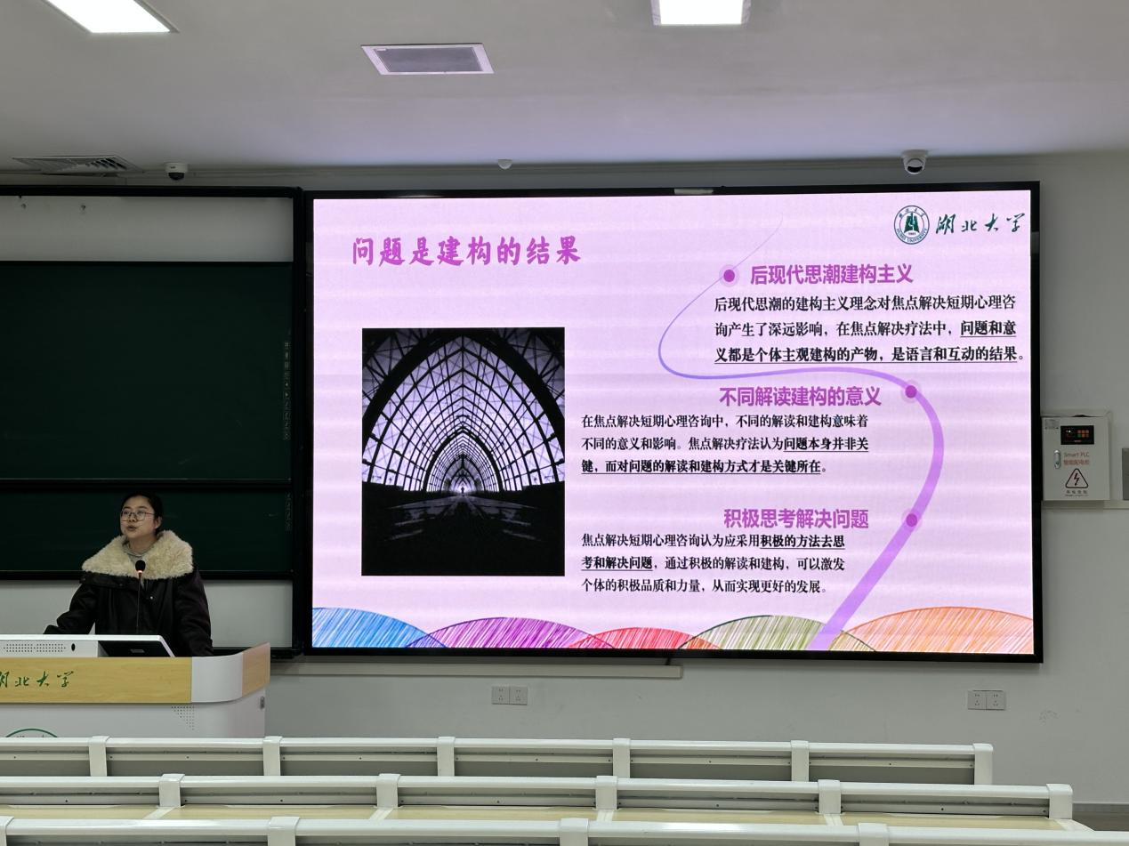 朱奎闽以“研究生的积极心态培养与生涯发展”为专题,过理论讲解与案例分析相结合的方式,聚焦“解决短期心理咨询疗法”,辅以视频与图片展示,引导同学们以积极、建设性的视角看待问题。朱奎闽强调要避免陷入“追溯原由”的思虑怪圈,而要关注切实可行的解决路径,为同学们提供了务实有效的心理调适思路。