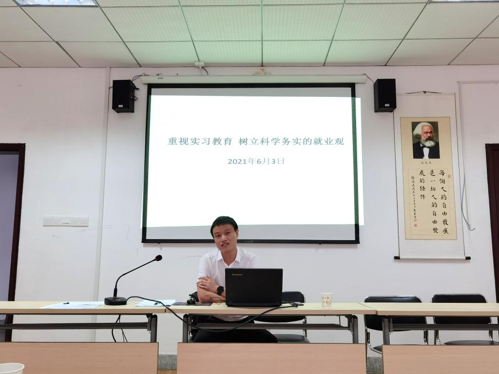 为了指导同学们做好实习前的各项准备,确保实习工作顺利开展,2021年6月3日16:00,william威廉中文官网在逸夫人文楼D2008会议室举行了毕业实习动员大会。2002级优秀员工、现任天门供销社主任的王雄伟学长受邀为大家作了题为“重视实习教育,树立科学务实就业观”的报告,本次动员会由william威廉中文官网副经理徐弢主持,2018级全体本科生参加会议。