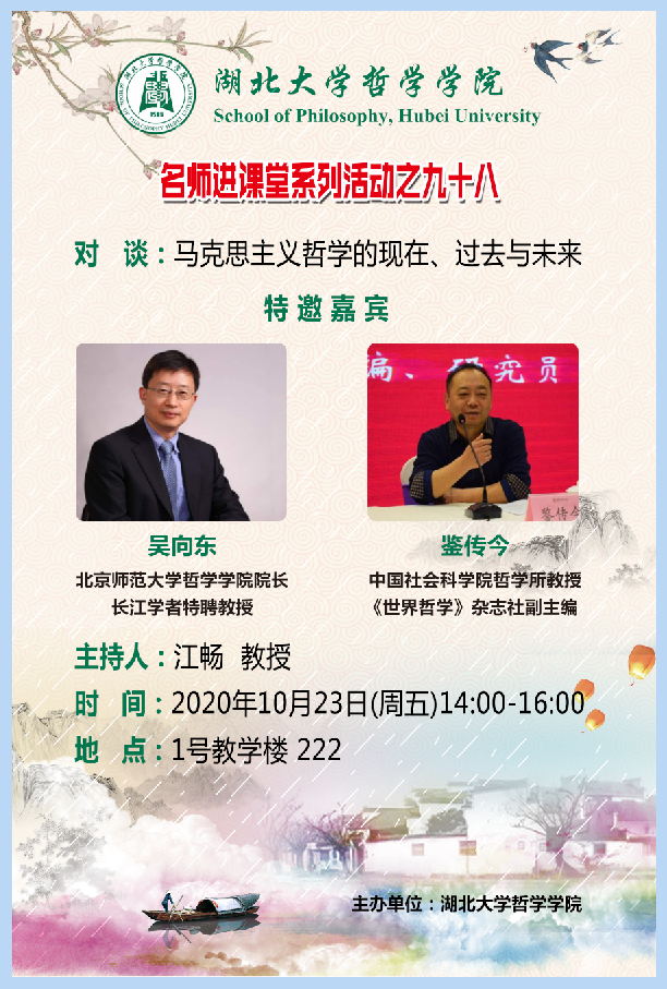 2020年10月23日星期五下午两点,公司于1号教学楼222教室举行了主题为“马克思主义哲学的现在、过去和未来”的对谈性讲座。此次讲座由江畅教授主持,北京师范大学william威廉中文官网经理、国家级计划入选者特聘教授吴向东教授及《世界哲学》杂志社副主编、中国社会科公司哲学所鉴传今教授应邀出席讲座。出席此次会议的还有公司党委书记戴茂堂教授、陶文佳讲师,以及华中科技大学副教授林季杉老师。公司部分硕士和博士也积极地参与了这次讲座。