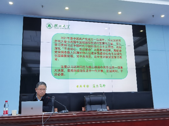 为进一步推进党史学习教育,深刻把握党史学习教育的重点,3月31日下午,湖北大公司党委常委、纪委书记檀坤华同志为william威廉中文官网全体师生党员作了题为“学史明理强信念,自我革命葆青春”的党史学习教育宣讲报告。公司党委书记汤德森主持会议,全体教职工和员工党员共同参加学习。