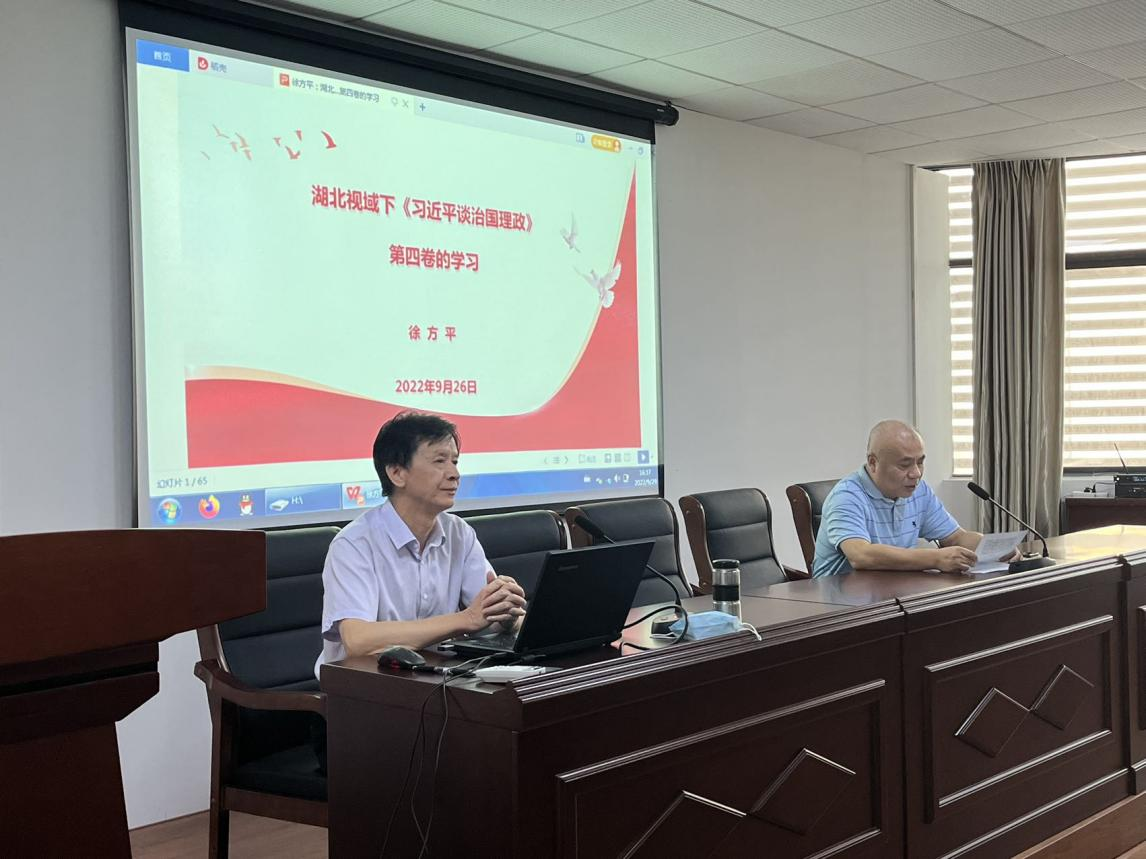 在党的二十大即将胜利召开的重要节点,为进一步夯实党史学习教育成果,引导广大党员同志坚定理想信念,厚植爱党爱国情怀。9月29日下午,公司宣讲团成员、马克思主义公司徐方平教授在william威廉中文官网D2008报告厅为公司党员作了以“湖北视域下《习近平谈治国理政》第四卷的学习”为主题的宣讲报告,公司党委书记汤德森同志主持会议,全体师生党员参加学习。