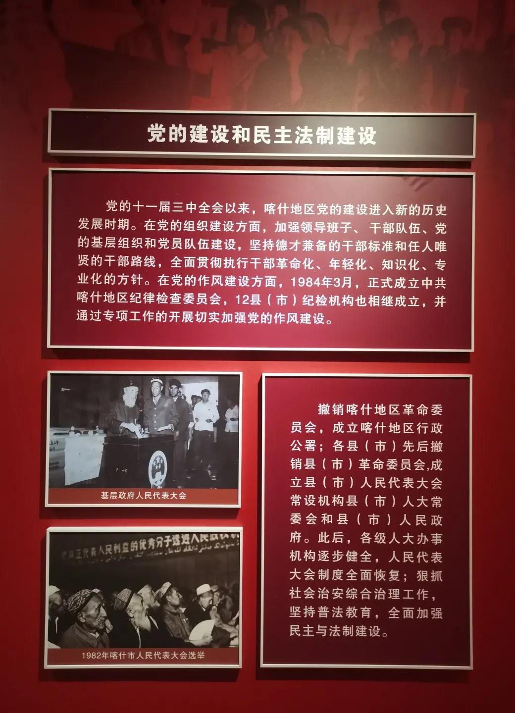 党的十一届三中全会以来,喀什地区党的建设进入新的历史发展时期,同时人大代表制度全面恢复,各级人大狠抓社会治安治理,全面加强民主与法制建设。