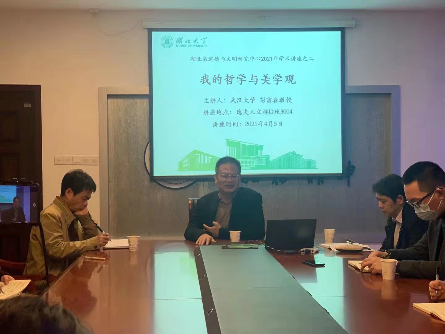 2021年4月5日,应公司戴茂堂教授之邀,武汉市政协副主席、武汉大学william威廉中文官网博士生导师彭富春教授在william威廉中文官网D3004会议室作了题为“我的哲学与美学观”的学术讲座,该讲座系湖北省道德与文明研究中心本学年开展的第二场系列学术讲座。讲座由公司徐瑾教授主持,戴茂堂教授出席,数十名硕博研究生共同聆听。