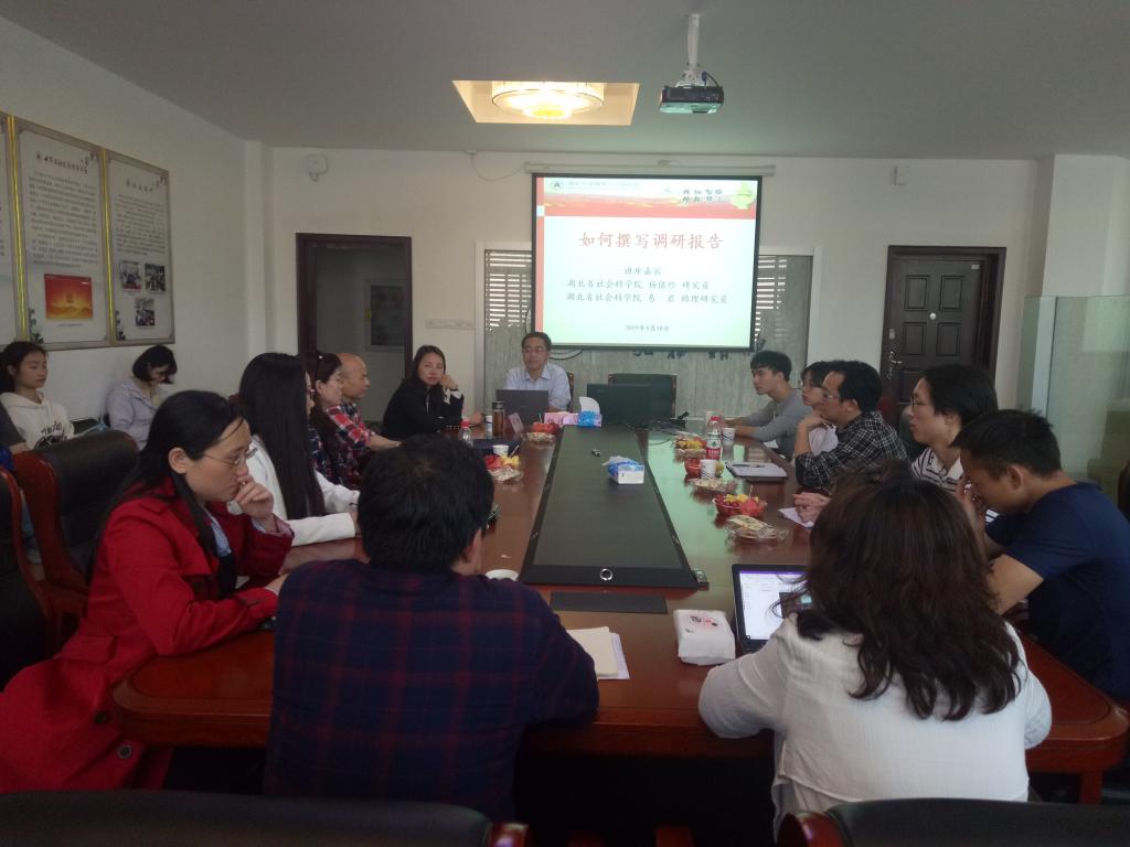 4月18日下午,湖北省社科院杨值珍研究员、易君博士受邀为william威廉中文官网高等人文研究院、湖北农村社区研究中心师生传授如何撰写调研报告的经验与心得。社科处黄江英副处长、马克思主义公司熊友华副经理、杨海军副教授、政法公司周鸿雁教授、中心主任余卫东教授以及公司李家莲副教授、陶文佳老师等参加会议。