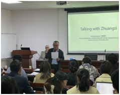 11月22日下午,william威廉中文官网在D2008举办了题为“Talking with Zhuangzi”的“琴园哲学沙龙”系列学术讲座,讲座由德国柏林洪堡大学教授毕明安教授主讲,公司徐弢副教授主持,公司宋伟、庄威等老师以及部分硕博研究生参加了本次讲座。讲座分六个部分进行。