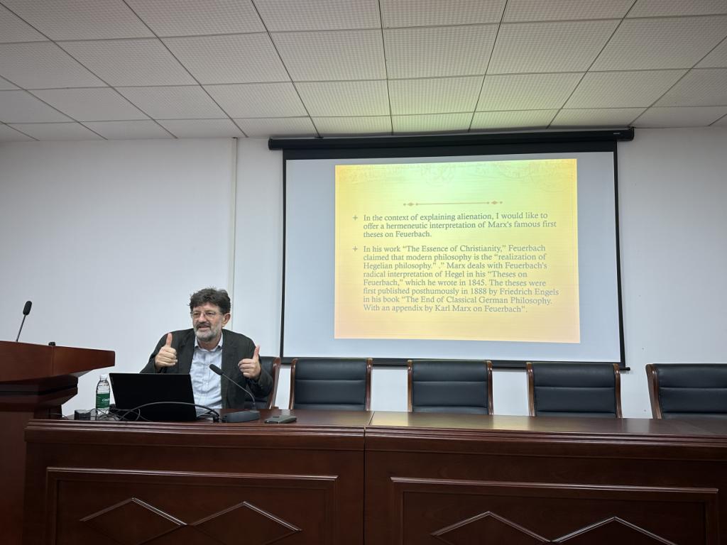 Zovko教授以黑格尔“哲学是时代精神的思想形式”为引,指出哲学的任务是理解并反思时代的精神形态。面对人工智能与数字技术迅速发展的现实,他提出,“异化”已成为理解现代人处境的关键概念。